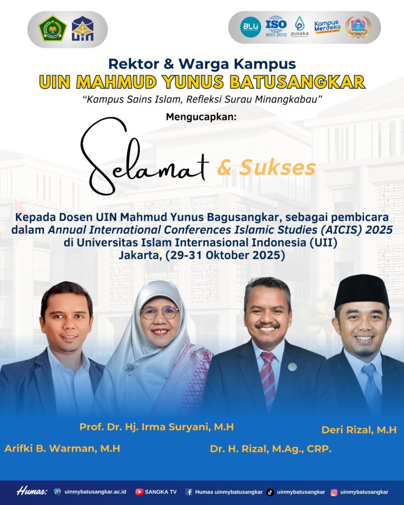 Batusangkar – Universitas Islam Negeri (UIN) Mahmud Yunus Batusangkar patut berbangga. Empat dosennya dinyatakan lolos sebagai presenter Open Panel Annual International Conference on Islam, Science, and Society (AICIS) ke-24 dan akan mempresentasikan artikel penelitiannya pada 29–31 Oktober 2025 di Universitas Islam Internasional Indonesia (UIII) Jakarta, dan dihadiri para ilmuwan, peneliti, akademisi, dan praktisi dari dalam serta luar negeri.